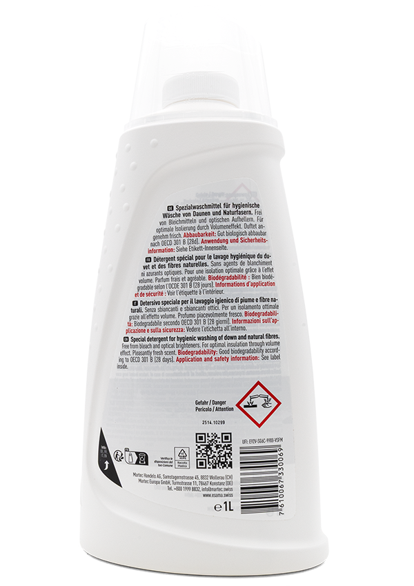 Lessive spéciale pour le lavage hygiénique des duvets et des fibres naturelles. Regraissant durable et sans agents de blanchiment ni éclaircissants optiques. Pour une isolation optimale grâce à l’effet de volume. Parfume agréablement et fraîchement et est biodégradable.